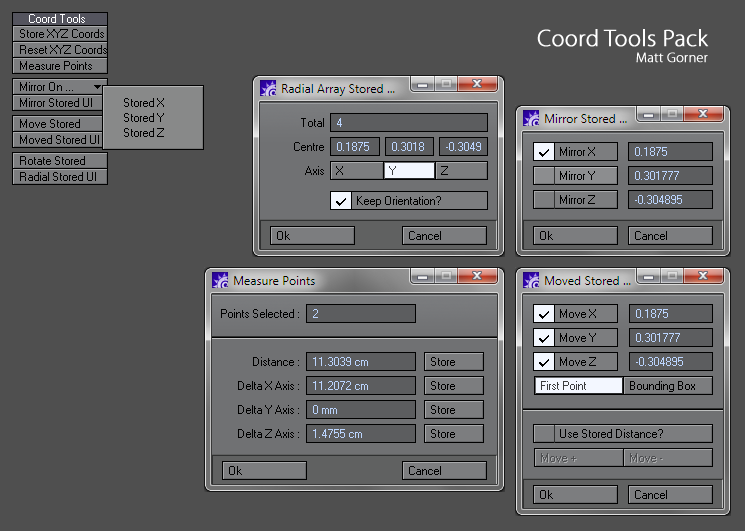 A time saving bunch of Modeler tools (Move, Mirror, Rotate, Radial Array) that work in conjunction with user stored X,Y,Z coordinates that can be picked from any existing geometry
