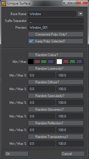 Assigns all selected polys (or connected) with a unique surface name, has intelligent naming so that the names in the surface editor appear in the correct order. You can also apply random surface properties too